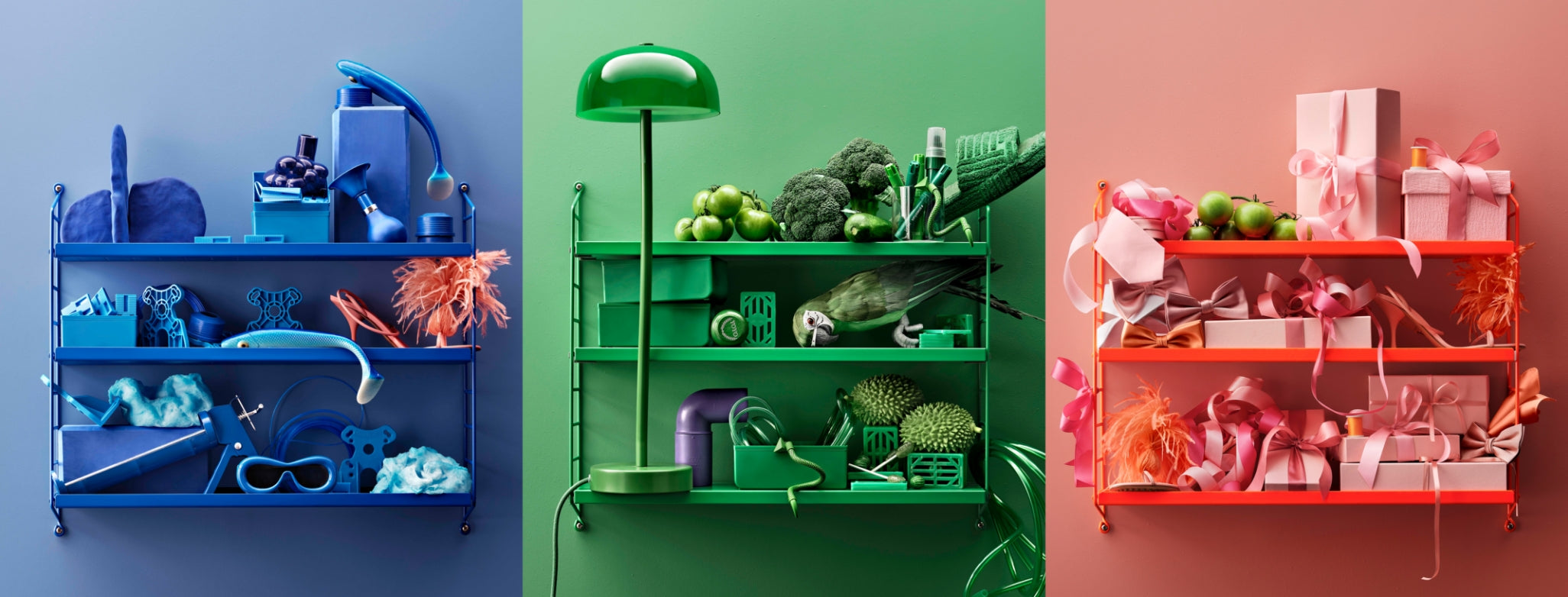 En tres repisas y dos paneles, consigues 180 centímetros lineales para poner tus cosas favoritas. La consigues en colores lisos como blanco, gris, verde y beige, y en chapa de madera natural de roble, nogal, fresno o fresno teñido negro. Queda bien donde la pongas.