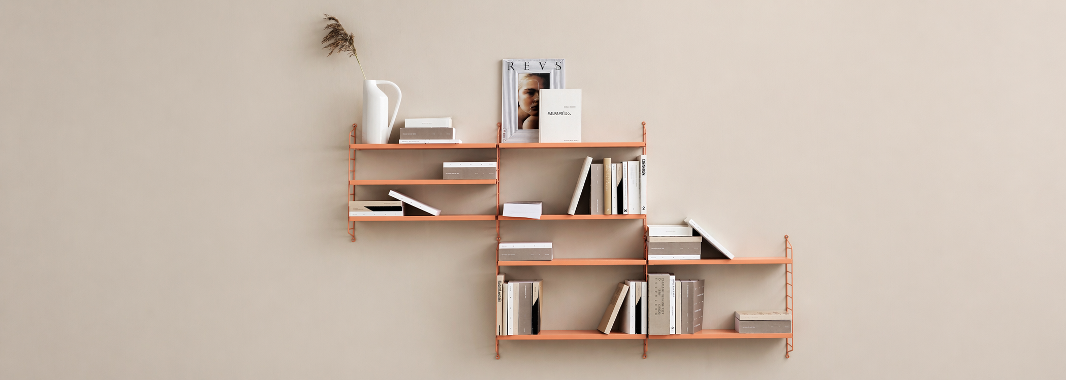En tres repisas y dos paneles, consigues 180 centímetros lineales para poner tus cosas favoritas. La consigues en colores lisos como blanco, gris, verde y beige, y en chapa de madera natural de roble, nogal, fresno o fresno teñido negro. Queda bien donde la pongas.